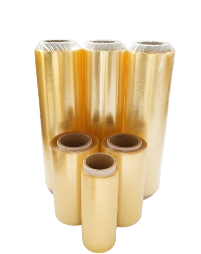 Película extensible en PVC apta para contacto con alimentos, color tabaco con un espesor de 10 micras; su presentación viene en varias medidas y cantidades.